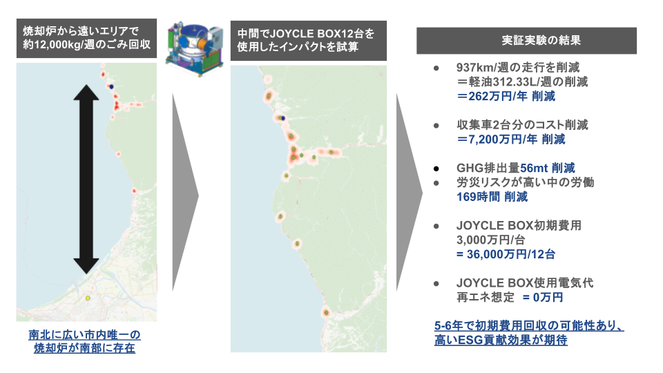 JOYCLE BOXの運用コストを見積もっても5-6年で初期費用(12台導入*3,000万円/台=3.6億円)回収可能性があることが判明し、大型焼却炉への輸送処理とのハイブリッド活用の有効性をaiESG算出のデータにより証明することが出来ました。