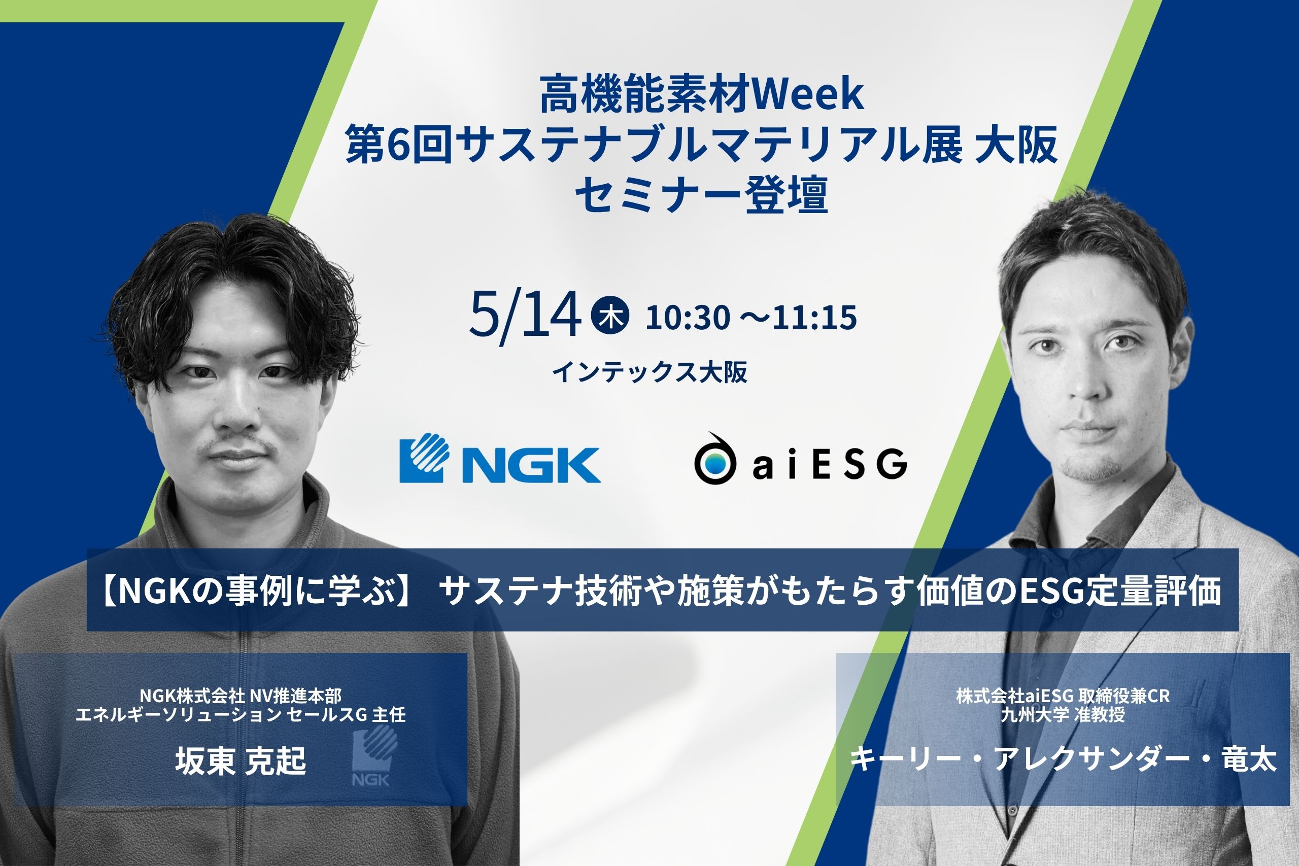 株式会社aiESG(アイエスジー、本社:福岡県福岡市、代表取締役:馬奈木 俊介/以下、aiESG)は、この度、NGK株式会社(本社:愛知県名古屋市、代表取締役社長:小林 茂/以下、NGK)をゲストにお招きし、高機能素材Weekの「第6回サステナブルマテリアル展」会期中にセミナー「【NGKの事例に学ぶ】 サステナ技術や施策がもたらす価値のESG定量評価」を開催します。